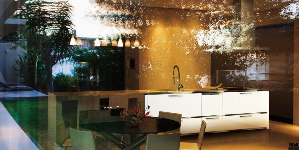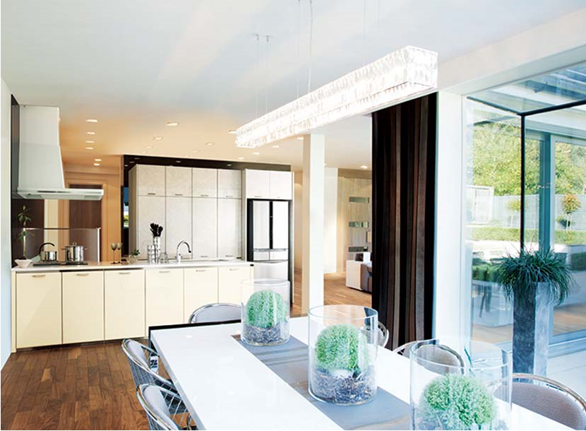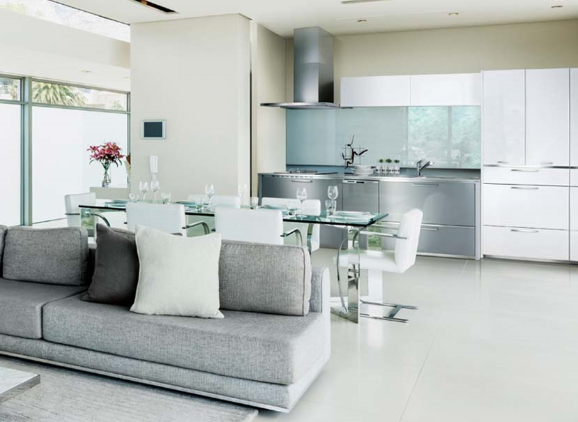 ステンレスと鏡面ホワイトのキッチンとガラスのテーブルと