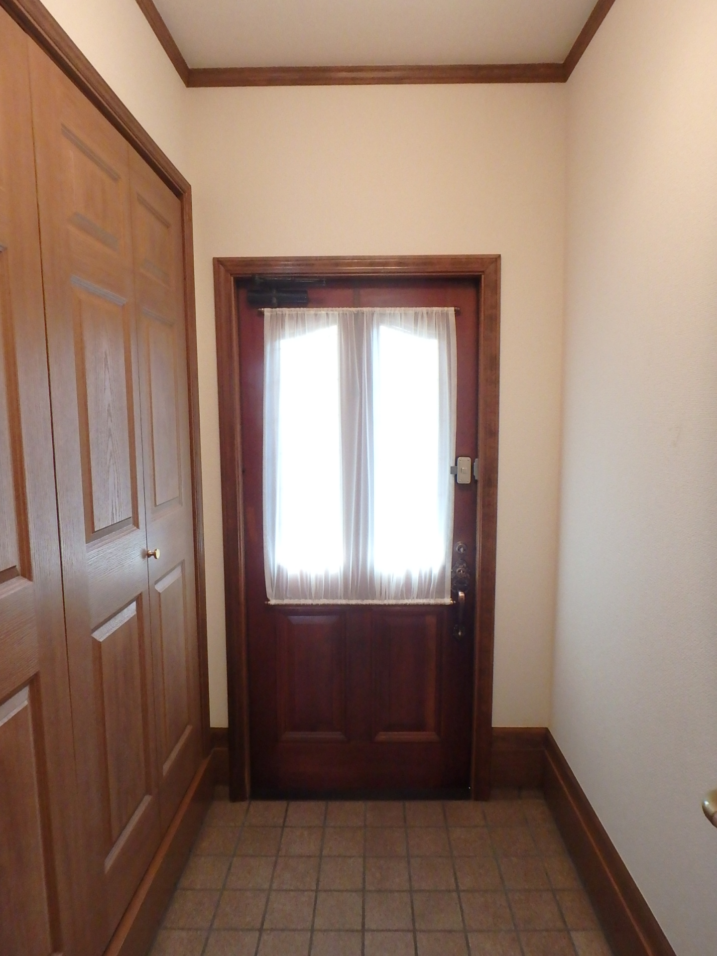 玄関ドアのガラス部分には”レースカーテン”