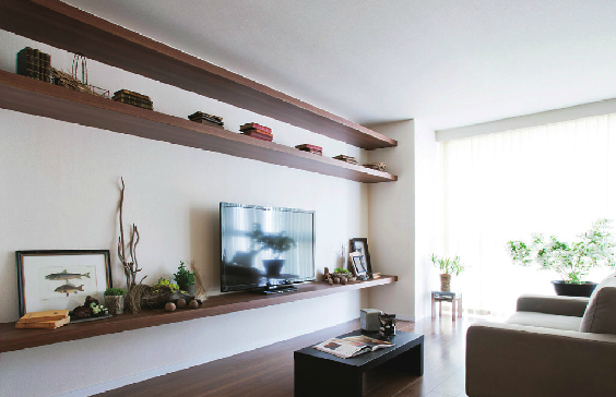 下段にはDVDを始めAV機器の収納スペース用は6cm厚のカウンター材で