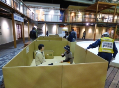 工場内の避難所として提供されるブースに段ボールを利用したキットで