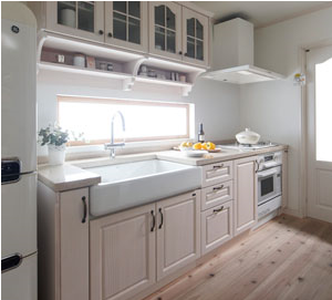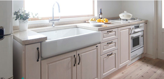 [ホーロ製エプロンタイプのシンク]、そしてホワイト塗装されたパインの扉