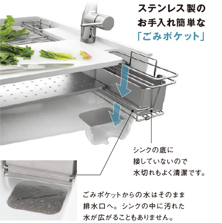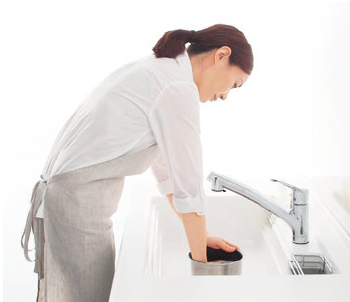 通常ですと[残菜(切りかす)]は、水栓で三角コーナーに向かって…